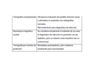 Este documento describe el enfoque traumatológico del pie diabético. Define el pie diabético y discute su epidemiología. Explica la clasificación de riesgo del pie diabético y los exámenes requeridos para el diagnóstico. Detalla los tratamientos como la prevención, desbridamiento quirúrgico y cirugía, e indica las circunstancias que requieren amputación. Finalmente, resume los tipos de amputaciones menores y mayores, así como las complicaciones y el seguimiento posterior.