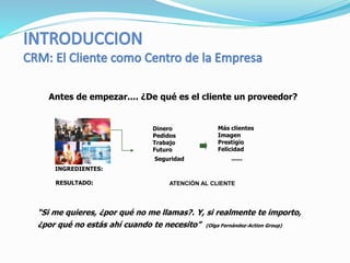 1. El CRM busca centrar la empresa en el cliente mediante el conocimiento y análisis de sus necesidades para mejorar la retención y fidelización.