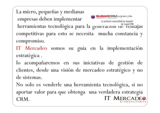 El documento habla sobre la importancia de que las micro, pequeñas y medianas empresas implementen herramientas tecnológicas de gestión de clientes o CRM para generar ventajas competitivas. La compañía IT Mercadeo ofrece servicios de implementación estratégica de CRM con enfoque en el mercadeo, no solo en sistemas. El CRM que ofrecen permite administrar información de clientes, mercadeo, ventas, servicio al cliente y más, a través de módulos personalizables y a precios asequibles.