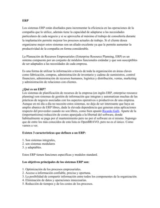 CRM se refiere a una estrategia de negocios centrada en el cliente que recopila información sobre clientes para comprender sus necesidades y mejorar la atención al cliente. Los sistemas CRM automatizan el manejo de las relaciones con clientes y permiten a las empresas interactuar más efectivamente con los clientes. Los ERP son sistemas integrados que automatizan procesos operativos como fabricación, inventario y finanzas para aumentar la eficiencia en toda la organización.