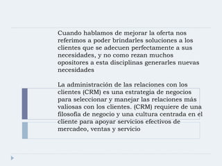 CRM es una estrategia de negocios centrada en el cliente que implica recopilar y analizar información sobre los clientes para conocer sus necesidades y mejorar la oferta. Implica el uso de sistemas de tecnología y canales múltiples como el teléfono e Internet para crear una relación duradera que brinde valor a la empresa y el cliente.