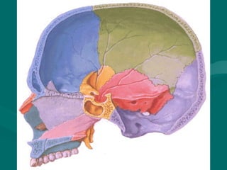 El documento describe los huesos que conforman el cráneo, incluyendo el frontal, etmoides, esfenoides y occipital. Explica la ubicación y vistas de cada hueso desde diferentes ángulos, como la vista superior, lateral, anterior y posterior.