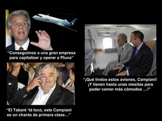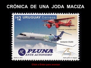 El documento es una crónica satírica de la quiebra de la aerolínea estatal uruguaya Pluna. Relata cómo la empresa fue mal administrada y terminó acumulando deudas hasta que finalmente se declaró en quiebra. Los aviones fueron vendidos en subasta pero el dinero obtenido no se usó para pagar las deudas, sino que terminó desapareciendo. La crónica sugiere corrupción y malos manejos políticos detrás del colapso de Pluna.