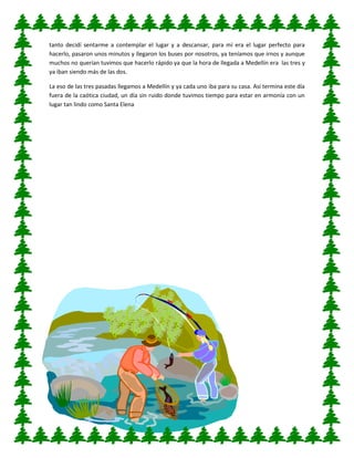 El documento describe un viaje de estudiantes del colegio Loyola al parque Arví en Santa Elena, Medellín. Los estudiantes de grados 9 a 11 tomaron buses hacia el parque, haciendo paradas para ver las vistas de Medellín y comprar en tiendas. Luego de unas horas de viaje llegaron al parque, donde caminaron durante dos horas y media, almorzaron y vieron una demostración canina. Finalmente llegaron a un río antes de que los buses los recogieran y los llevaran de regreso a Medellín.