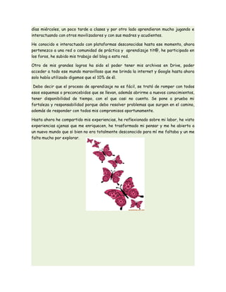Este documento describe la experiencia de una docente en formación al participar en el curso TIT@. El curso le enseñó a crear un blog para compartir su red de aprendizaje y su ambiente de aprendizaje. También aprendió a utilizar nuevas plataformas y aplicaciones que puede usar con sus estudiantes. El proceso de aprendizaje ha sido un desafío, pero le ha permitido abrirse a nuevos conocimientos y herramientas como Google Drive.