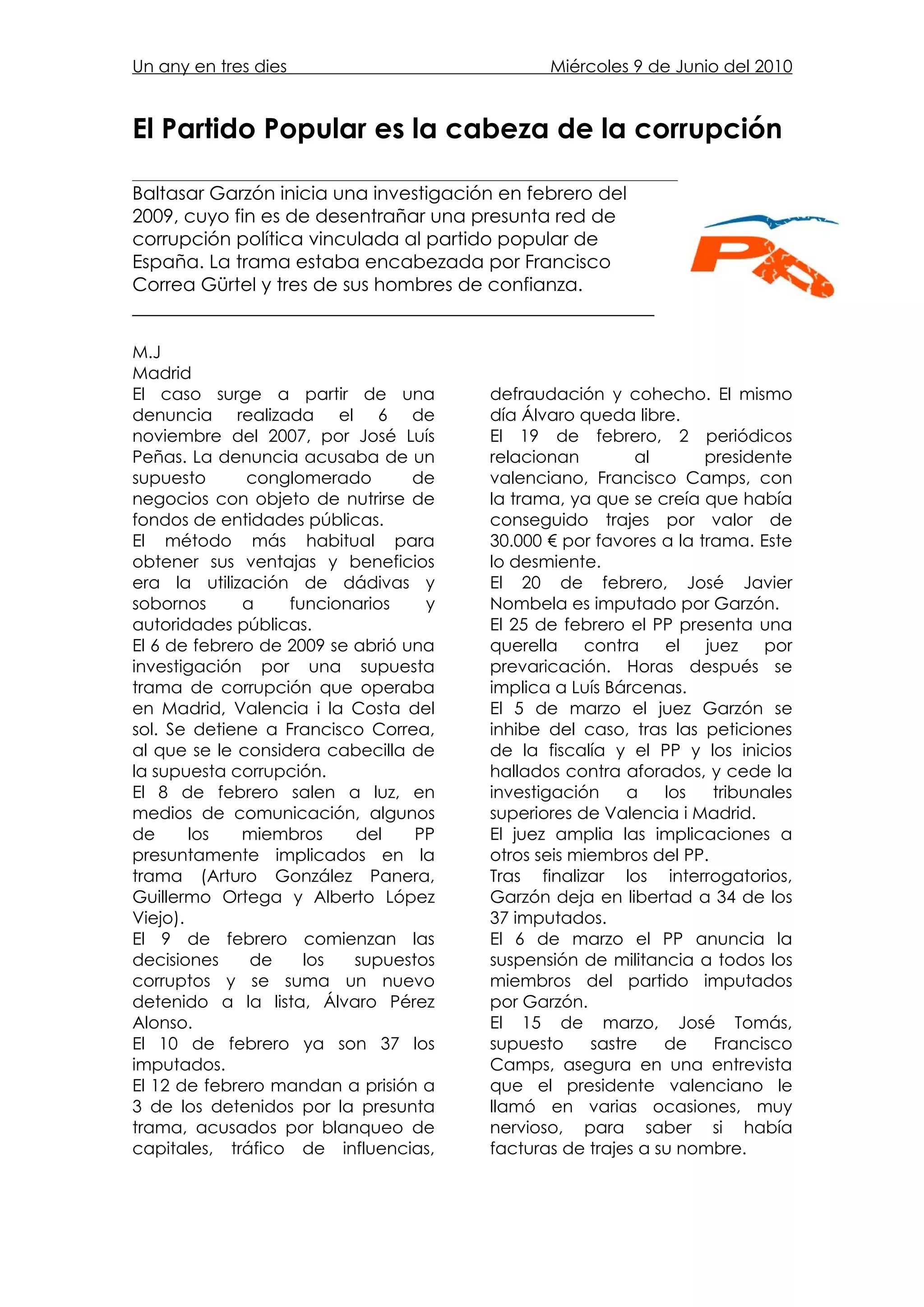 El juez Baltasar Garzón inició una investigación en 2009 sobre una presunta red de corrupción vinculada al Partido Popular de España encabezada por Francisco Correa. A lo largo de los meses siguientes se detuvo e imputó a decenas de personas vinculadas al PP, incluyendo altos cargos. La investigación reveló indicios de que la trama se financiaba a través de sobornos a cambio de contratos públicos. El caso generó una gran polémica política y judicial.