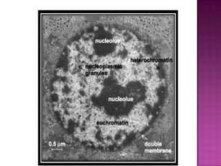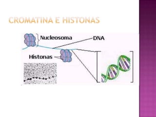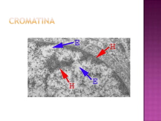 El documento describe la organización de la cromatina en el núcleo celular. El ADN genómico forma complejos con proteínas y se enrolla en diferentes niveles de organización, incluyendo nucleosomas, solenoides de 30nm y bucles. La cromatina puede ser heterocromatina constitutiva, compactada y estable, o heterocromatina facultativa y eucromatina, las cuales pueden ser activas o inactivas.