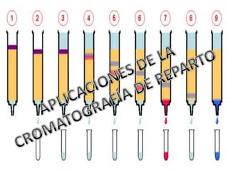 Este documento describe la cromatografía de partición, un método cromatográfico desarrollado en los años 1940. Explica que usa una fase estacionaria líquida anclada a un soporte sólido y una fase móvil líquida inmiscible. También describe los tipos de columnas usadas, incluyendo columnas de fase líquida unida, y explica cómo la polaridad de la fase estacionaria y móvil afecta la elución de los compuestos.