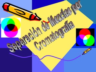 Este documento explica cómo separar los componentes de una mezcla utilizando la técnica de cromatografía. La cromatografía separa sustancias basándose en sus diferentes velocidades de movimiento a través de un medio poroso impulsadas por un disolvente. El documento guía un experimento para separar los pigmentos de una tinta comercial usando un papel poroso y alcohol como disolvente. Al ascender el alcohol por la tira de papel, arrastra los pigmentos a diferentes velocidades, depositándolos en franjas de col