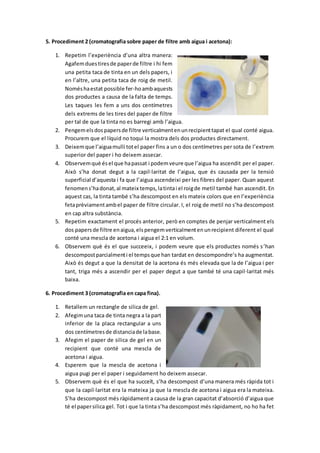 Este documento describe tres procedimientos de cromatografía realizados para separar los componentes de varias mezclas. En el primer procedimiento se utilizó cromatografía en papel de filtro circular con agua, separándose cinco componentes de la tinta negra y dos de la tinta roja. En el segundo procedimiento con papel de filtro y agua/acetona, solo se pudieron probar la tinta negra y rojo de metilo. Finalmente, en cromatografía en capa fina con silica gel y agua/acetona los resultados fueron par