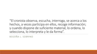 La crónica es un género periodístico que narra hechos de actualidad desde la perspectiva subjetiva del cronista. Se sitúa entre la noticia, la opinión y el reportaje. El cronista informa sobre los hechos, pero también añade su interpretación personal y recrea la atmósfera para el lector. La crónica busca informar, formar opinión y entretener al público.