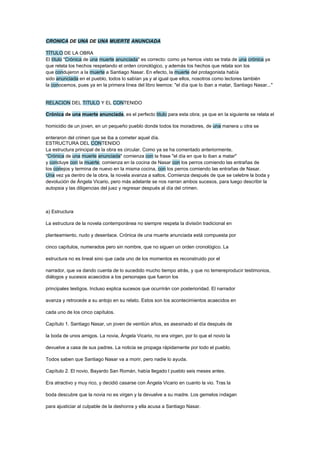 La novela Crónica de una muerte anunciada tiene una estructura no lineal compuesta por cinco capítulos que no siguen un orden cronológico. Cada capítulo reconstruye momentos del pasado a través de testimonios y diálogos de los testigos, e incluso explica sucesos posteriores. La novela comienza con el asesinato de Santiago Nasar y concluye con su muerte, recreando los hechos que condujeron al crimen anunciado. Los sucesos se reconstruyen desde varias perspectivas a través