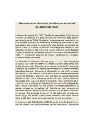 Este documento describe la experiencia de una maestra en un diplomado de formación de ambientes de aprendizaje. El diplomado enseñó sobre el uso de herramientas tecnológicas en la enseñanza, incluyendo tablets, blogs, y la plataforma educativa. También cubrió temas como el trabajo en equipo, la planeación de lecciones, y modelos pedagógicos como TPACK. La maestra superó su miedo a la tecnología y disfrutó aprendiendo nuevas habilidades y compartiéndolas