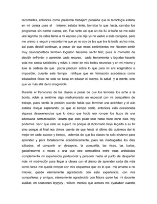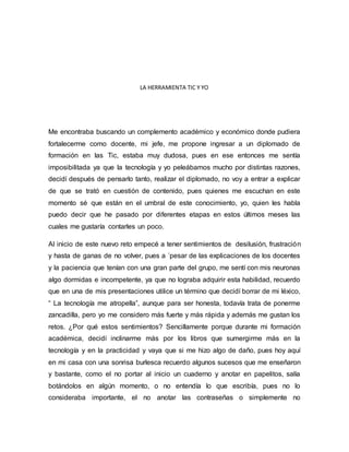 La autora describe su experiencia inicialmente frustrante al realizar un diplomado en TIC, sintiéndose incompetente con la tecnología. Sin embargo, con el tiempo fue superando sus miedos y aprendiendo los recursos, lo que la hizo sentirse satisfecha y capaz. Aunque tuvo desacuerdos iniciales con un compañero, al final pudieron trabajar juntos de manera constructiva. La autora concluye agradecida por haber completado el diplomado y por el apoyo recibido de compañeros, docentes y su jefe.