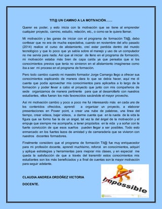 La autora tenía poca motivación al comenzar el programa Tit@ debido a su falta de conocimientos tecnológicos. Sin embargo, su maestro Jorge Camargo explicó los conceptos claramente y le mostró cómo aplicar sus habilidades. Esto aumentó su motivación y aprendió a crear presentaciones, videos y proyectos con sus estudiantes. El programa mejoró sus habilidades docentes y ahora se siente motivada a transmitir sus nuevos conocimientos para beneficiar a sus estudiantes.