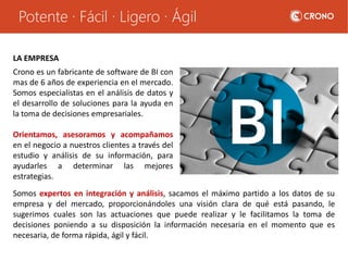 Crono es un fabricante de software de Business Intelligence con más de 6 años de experiencia. Ofrece una plataforma de BI que combina potencia y facilidad de uso para proyectos grandes y pequeños. Su principal característica es la facilidad de uso de todos sus componentes, permitiendo que cualquier persona pueda consultar o construir informes o cuadros de mando sofisticados. Crono propone una solución de BI integrada y completa siguiendo las buenas prácticas de arquitectura de datos.