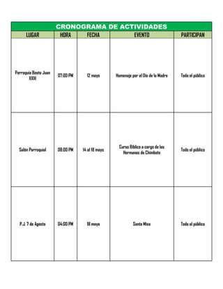 El cronograma detalla tres eventos que tendrán lugar en la Parroquia Beato Juan XXIII y sus alrededores durante mediados de mayo. El 12 de mayo se realizará un homenaje por el Día de la Madre a las 7 pm. Del 14 al 18 de mayo las Hermanas de Chimbote dictarán un Curso Bíblico a las 8 pm en el Salón Parroquial. El 18 de mayo se celebrará una Santa Misa a las 4 pm en la P.J. 7 de Agosto.