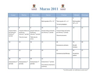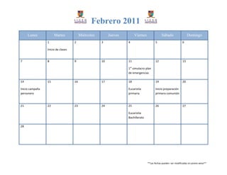 Este documento presenta el calendario escolar de un colegio para los meses de febrero a julio de 2011. Incluye fechas importantes como el inicio de clases, simulacros de emergencia, reuniones de padres de familia, evaluaciones, y vacaciones como la semana santa y el receso de mitad de año. El calendario está sujeto a posibles cambios.