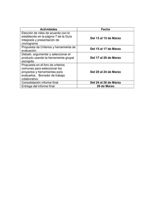 El documento presenta el cronograma de actividades de un proyecto que se desarrollará entre el 13 y 26 de marzo. En la primera semana, los participantes elegirán sus roles de acuerdo a la guía y presentarán el cronograma. Luego, propondrán criterios y herramientas de evaluación para debatir y seleccionar un producto la siguiente semana. Más adelante, propondrán criterios comunes en un foro y elaborarán un borrador colaborativo. Finalmente, consolidarán el informe final para entregarlo el 26 de mar