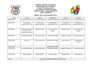 El documento presenta el cronograma de actividades de la segunda jornada de práctica de una alumna en un jardín de niños. La agenda incluye actividades diarias como honores a la bandera, ejercicio, lectura en voz alta y recreo, así como temas de aprendizaje como valores, convivencia y respeto que variarán durante la semana.