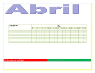 El documento presenta un calendario de actividades realizadas entre los días 1 y 31. Incluye tareas como delimitación de problemas, indicadores, implementación de estrategias y recolección de indicadores. Algunas actividades se realizaron durante varios días consecutivos, mientras que otras solo un día específico.