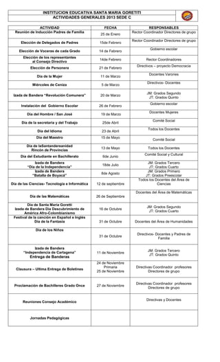 El documento presenta el cronograma de actividades académicas y generales para el año 2014 de la Institución Educativa Santa María Goretti Sede C. Divide el año escolar en 4 períodos lectivos y 5 semanas de planeación, e incluye las fechas de vacaciones de estudiantes y docentes. Además, detalla las fechas de evaluaciones, reuniones y entrega de boletines, así como las actividades especiales que se realizarán.