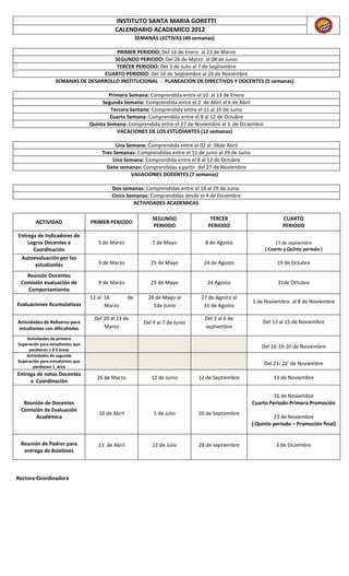 El documento presenta el calendario académico y las actividades generales del Instituto Santa María Goretti para 2012, incluyendo 4 períodos lectivos de enero a noviembre, semanas de desarrollo institucional, vacaciones de estudiantes y docentes, y fechas para evaluaciones, entrega de notas, y reuniones con padres de familia. También enumera diversas actividades especiales que tendrán lugar a lo largo del año.