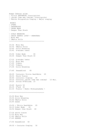 Este documento contiene la agenda de un evento de anime que incluye presentaciones musicales como Miss Hey, Girls Breaking y SexxxBlood. También incluye concursos como un quiz sobre Death Note, un concurso de cosplay y uno de quién puede comer más comida, así como sorteos y fiesta al final.