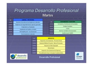 Este documento presenta un programa de desarrollo profesional con cursos sobre impuestos, temas laborales y previsionales, y contabilidad y auditoría. Los cursos se dictarán los lunes, martes, miércoles y jueves con diferentes temas cada día de la semana.