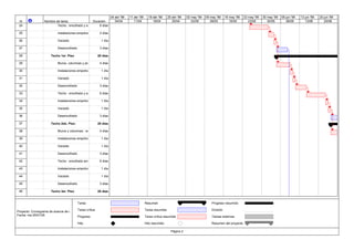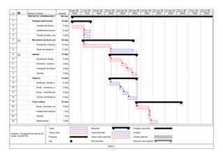 El documento presenta un cronograma de 156 días para la construcción de un proyecto de vivienda multifamiliar que incluye 10 fases principales como limpieza del terreno, movimiento de tierra, excavación, construcción de cimientos, muros y pisos, instalación eléctrica y sanitaria, y acabados interiores y exteriores. El proyecto requiere la coordinación de más de 70 tareas individuales para su finalización a finales de octubre.
