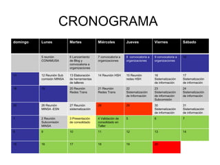 El cronograma detalla las actividades de una organización durante el mes, incluyendo reuniones con CONAMUSA, el lanzamiento de un blog, convocatorias a organizaciones, reuniones con subcomisiones de MINSA y redes de salud, sistematización de información, y una validación final de la información en un taller.