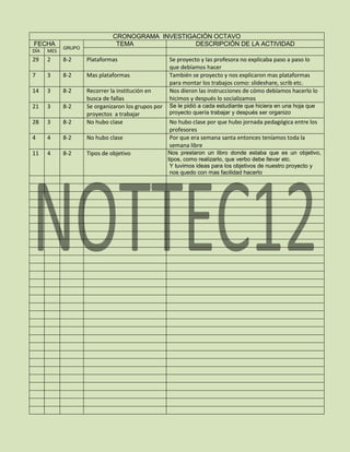 El cronograma detalla las actividades del grupo 8-2 durante marzo y abril. En marzo, la clase aprendió sobre plataformas digitales para proyectos, recorrió la institución para identificar fallas y organizó grupos por proyectos. En abril, no hubo clase debido a feriados de semana santa y jornada pedagógica, y la clase aprendió sobre tipos de objetivos para sus proyectos.