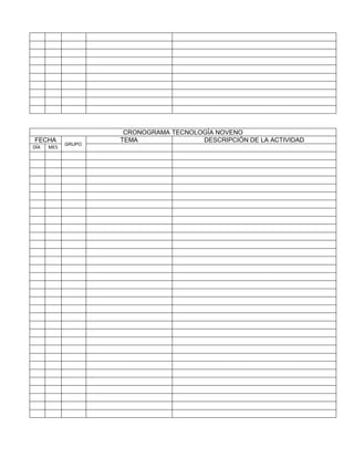 El cronograma describe las actividades del laboratorio de tecnología del noveno grado durante marzo y abril. En marzo, los estudiantes trabajaron en editar su blogger y thinkquest, mejorar sus páginas web, y aprender sobre el formato de bitácora y cronograma. También se explicó cómo elaborar un anteproyecto. En abril, no hubo clase debido a una jornada pedagógica del personal docente.