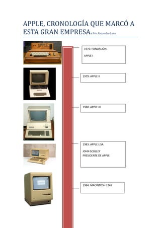 Apple fue fundada en 1976 y lanzó productos clave como el Apple I, Apple II y Macintosh entre 1976 y 1984, pero enfrentó luchas internas de poder que resultaron en el despido de Steve Jobs en 1985; Jobs regresó en 1997 y lideró el lanzamiento exitoso del iPod e iTunes en 2001, lo que ayudó a Apple a convertirse en la empresa con mayor capitalización del mundo en 2011.
