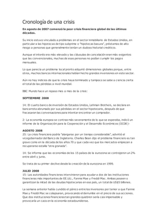 Este documento presenta una cronología mes a mes de la crisis financiera global que comenzó en agosto de 2007, vinculada inicialmente a problemas en el sector inmobiliario de Estados Unidos, en particular las hipotecas de alto riesgo. A lo largo de 2007 y 2008, varios bancos estadounidenses e internacionales anunciaron grandes pérdidas debido a su exposición a este mercado hipotecario, llevando a quiebras, fusiones y rescates gubernamentales. La crisis pronto tuvo un impacto global y llevó a