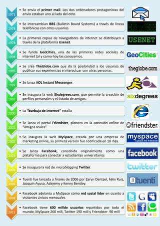 Este documento resume los hitos más importantes en el desarrollo de las redes sociales e internet desde 1971 hasta 2011, incluyendo el primer correo electrónico, el surgimiento de BBS y Usenet, el lanzamiento de pioneras redes sociales como GeoCities, Sixdegrees y Friendster, y el auge de plataformas líderes como Facebook, Twitter y Tuenti.