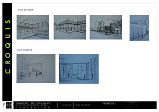 Este documento presenta los croquis de vista exterior e interior de un proyecto arquitectónico. El proyecto 1 fue realizado por el alumno Miguel Roco Ibaceta para la Facultad de Arquitectura, Urbanismo y Geografía de la Universidad de Concepción bajo la supervisión del profesor Luis Loiza Jara.