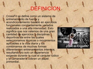 Este documento resume CrossFit, un sistema de entrenamiento de alta intensidad basado en ejercicios funcionales constantemente variados. Fue fundado en 2000 en Santa Cruz, California por Greg y Lauren Glassman. CrossFit se dirige a cualquier persona motivada e involucra ejercicios que usan implementos como kettlebells, cuerdas, barras y más para desarrollar fuerza, resistencia, flexibilidad y otras capacidades físicas.