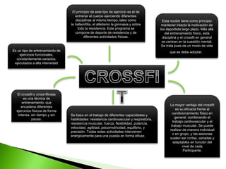El crossfit es un tipo de entrenamiento funcional que combina ejercicios de alta intensidad de diferentes disciplinas como halterofilia, atletismo y gimnasia. Se basa en trabajar la resistencia, fuerza, flexibilidad y otras habilidades a través de la variación constante de ejercicios. Además de los beneficios físicos, busca también mantener la motivación a largo plazo enfocándose en los aspectos mentales y adoptándolo como un estilo de vida.