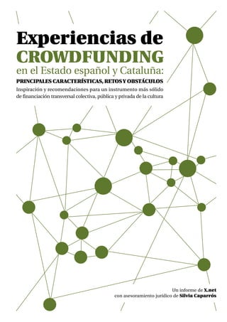 Este documento describe el desarrollo del crowdfunding en España y Cataluña, incluyendo los principales tipos de plataformas de crowdfunding, casos de estudio y problemas comunes. Analiza el marco legal del crowdfunding en España y ofrece recomendaciones para mejorar este método de financiamiento colectivo para proyectos culturales.