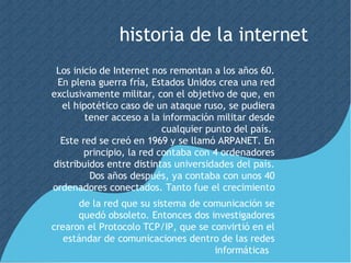 La historia de Internet comenzó en la década de 1960 cuando el gobierno de Estados Unidos creó la red ARPANET con fines militares. ARPANET creció y se abrió a fines académicos y de investigación, y los protocolos TCP/IP permitieron la comunicación entre redes. En la década de 1990, el navegador Mosaic popularizó la World Wide Web y condujo a un rápido crecimiento de Internet como lo conocemos hoy.