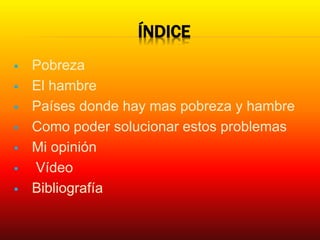 Este documento trata sobre la pobreza y el hambre en el mundo. Define la pobreza como la incapacidad de satisfacer necesidades básicas y el hambre como la falta de alimentos para sobrevivir. Identifica a países con altos niveles de pobreza y hambre. Propone que ofrecer más trabajos con salarios aceptables puede ayudar a resolver estos problemas y la autora cree que nadie debería sufrir de pobreza o hambre. Incluye enlaces a una video y fuentes bibliográficas.