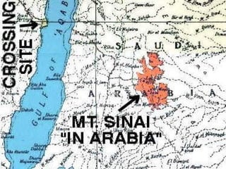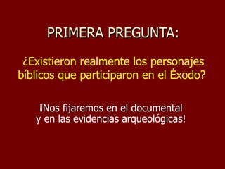 Este documento presenta evidencias arqueológicas que apoyan la historicidad de eventos bíblicos como el Éxodo, incluyendo la existencia de tumbas de personajes como Jacob, José y Aarón mencionados en la Biblia, así como ruinas y artefactos encontrados en la playa de Nuweiba en el Golfo de Aqaba, como ruedas, huesos y una columna que respaldan la narrativa bíblica del cruce milagroso del Mar Rojo. También muestra inscripciones e hitos encontrados en Arabia Saudita que valid