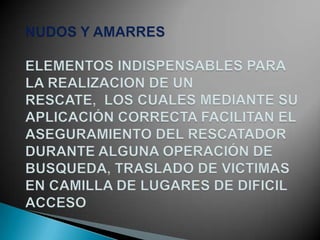 Este documento habla sobre las cuerdas, incluyendo sus características, materiales, usos y técnicas. Describe las cuerdas naturales hechas de fibras vegetales o animales, así como cuerdas sintéticas hechas de materiales como polipropileno y nylon. También explica cómo almacenar, limpiar y cuidar las cuerdas, así como nudos, anclajes y equipos de seguridad usados con cuerdas, como arneses y descensores.