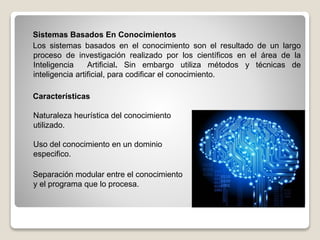 Este documento describe los sistemas basados en conocimiento y proporciona tres ejemplos: Siri, Viv y DeepMind. Siri es una aplicación que puede responder preguntas y solicitudes de forma conversacional. Viv tiene la capacidad de generar su propio código para vincular múltiples fuentes de información y brindar opciones. DeepMind ha creado un sistema neuronal diferenciable que puede resolver problemas utilizando solo su experiencia, similar a como lo haría un humano.