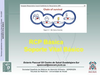 El documento proporciona información sobre el soporte vital básico. Explica que la reanimación cardiopulmonar (RCP) es el conjunto de maniobras utilizadas para revertir una parada cardiorrespiratoria (PCR). Describe la cadena de supervivencia, que incluye el reconocimiento temprano de la emergencia médica, la RCP temprana realizada por testigos, la desfibrilación temprana y el soporte vital avanzado. También presenta el algoritmo básico para la RCP en adultos, que consiste en comprobar