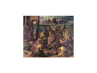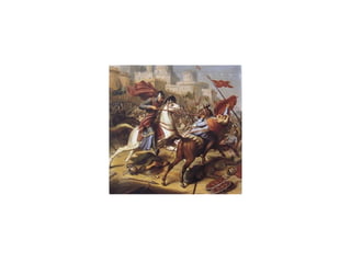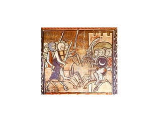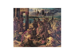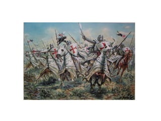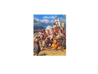 El documento resume las principales cruzadas entre los siglos XI y XIII, incluyendo los objetivos, resultados y batallas clave de cada una. La Primera Cruzada resultó en una victoria cristiana y el control de Tierra Santa. La Segunda Cruzada fracasó en recuperar Edesa pero logró algunas conquistas en la Península Ibérica. La Tercera llevó a la caída de Jerusalén. La Cuarta desvió su rumbo hacia Constantinopla. La Quinta intentó recuperar Jerusalén sin éxito. La Sexta