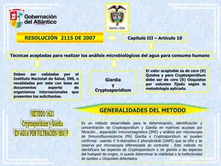 Este documento presenta los métodos aceptados para realizar análisis microbiológicos del agua para consumo humano en Colombia. Describe el método para la detección e identificación de Cryptosporidium y Giardia a través de filtración, separación inmunomagnetica y análisis de inmunofluorescencia. El valor aceptable para ambos parásitos es cero organismos por volumen de muestra.