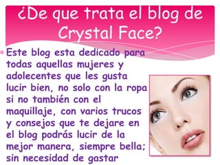 Este blog ofrece consejos gratuitos de maquillaje y estilo para mujeres y adolescentes, con el objetivo de mejorar su apariencia y autoestima a través de trucos, frases inspiradoras y videos. El blog enfatiza que la belleza viene de adentro y que una actitud positiva es más importante que cualquier cosmético.