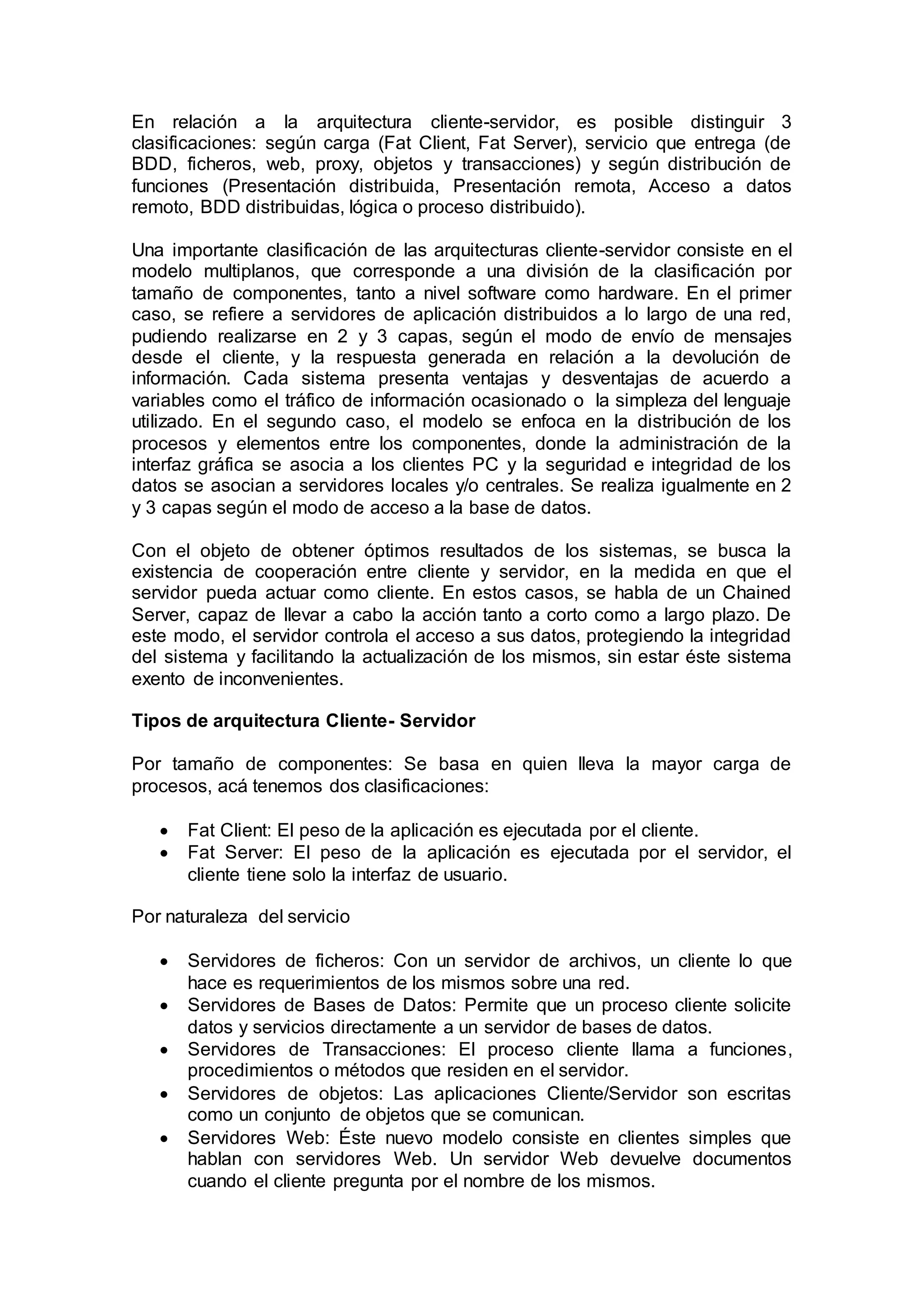 El documento describe las diferentes clasificaciones de las arquitecturas cliente-servidor, incluyendo por tamaño de componentes (Fat Client, Fat Server), por naturaleza del servicio (servidores de ficheros, bases de datos, transacciones, objetos, web, proxy), y por reparto de funciones entre cliente y servidor (presentación distribuida, presentación remota, lógica o proceso distribuido, acceso a datos remoto, bases de datos distribuidas). Concluye que el modelo cliente-servidor es flexible y adaptable, permite aumentar el rendimiento, y